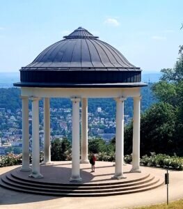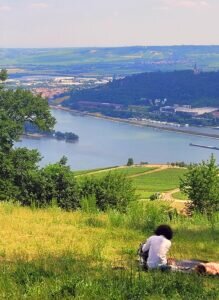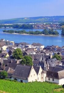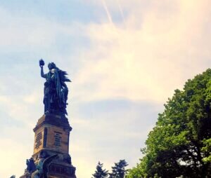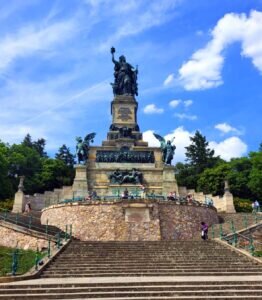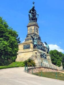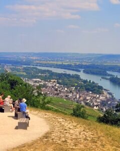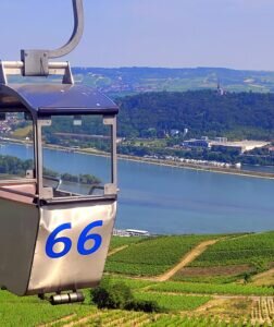 Wer Rüdesheim besucht, sollte das Niederwalddenkmal besichtigen. Die Fahrt mit der Gondel ermöglicht einen weiten Blick über die Weinberge, den Rhein und die hügelige Landschaft mit alten Burgen und kleinen Städten.