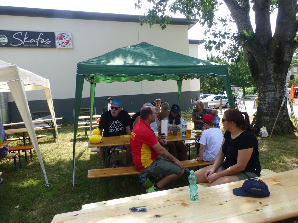 Hüpfburg, Knotenbretter und Mitbringbuffet auf der Wiese hinter dem Vereinsheim an der Lahn