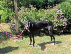 Artgenossen gegenüber ist sie freundlich und auch Katzen mag sie. Die sanfte Hündin liegt gerne auf der Couch und genießt ihr neues Leben in ihrer Pflegefamilie. Es macht Freude, ihre Flitzerunden Garten zu beobachten. Gerne liegt sie aber auch auf der Wiese und beobachtet die Vögel ohne Anstalten, Jagd auf diese zu machen.