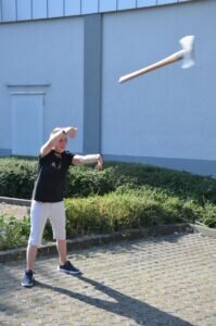 Über einhundert Besucher liesen sich Grundlagen des Axtwerfens beibringen und warfen dann die Axt zu ihrer eigenen Überraschung zum Teil genau in die Mitte der Zielscheibe.