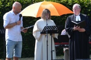 Sonntagmorgen war der ökumenische Gottesdienst im Holzheimer Schwimmbad ein Besuchermagnet. Pfarrer Mathias Bubel von der Evangelischen Kirchengemeinde, Pastoralreferentin Dr. Kerstin Rehberg-Schroth von der katholischen Kirche und Daniel Jung für die Evangelische Gemeinschaft wechselten sich in der Liturgie ab.