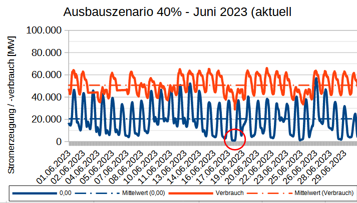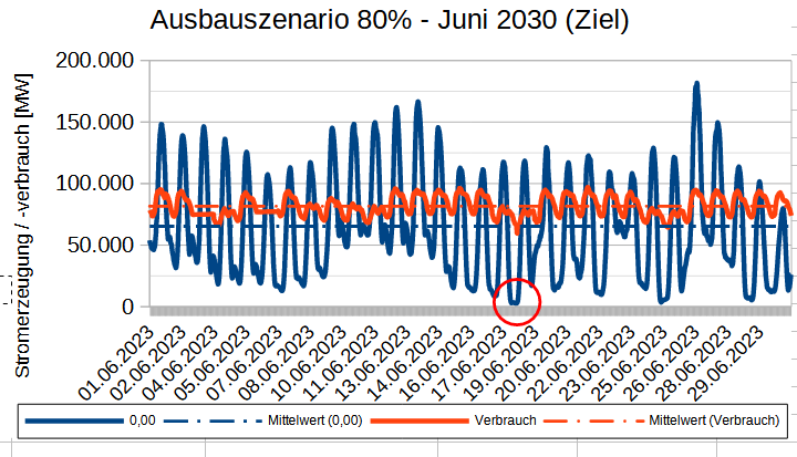 Der geplante 80%-Anteil wird, wie im Vormonat, erreicht durch eine Ver 3-fachung der Erzeugungsleistung aus PV + WEA. Die Volatilität wird durch den Ausbau nicht verringert sondern vergrößert. Die Wind- und PV-Anlagen können in Summe auch nur an 13 von 30 Tagen den 80% – Anteil erreichen, dann allerdings mit noch um ein Vielfaches über den Bedarf (Verbrauch) überschießenden Spitzen. Das Maximum trat am 26. Juni auf. Um die Mittagszeit (etwa 12 bis 15 Uhr) wurde der Durchschnittliche Verbrauch um 123% überschritten. Trotzdem treten immer noch ebenso zahlreiche Einbrüche auf, über den ganzen Monat verteilt. Ursache: Die Erzeugungsspitzen der Erneuerbaren können nicht für Schwachwindzeiten gespeichert werden. Die Anforderungen an Bedarfsdeckung, Netzstabilität und Verringerung des CO2-Ausstosses werden durch den bloßen Zubau an Anlagen bei fehlenden Speichern noch verstärkt. Der Maximale Fehlbetrag zwischen Erzeugungstiefststand der Erneuerbaren und dem Verbrauch etwa zur Monatsmitte (rot eingekreist) wächst auf 79.000 MW, nach der oben angegebenen Berechnung. Der entsprechende CO2-Ausstoß kann nur, gleiche Bedingungen wie im Juni 2023 vorausgesetzt, mit Sicherheit über dem aktuellen 2023er Wert (200 – 600 Gramm CO2 je kWh Stromerzeugung) liegen.