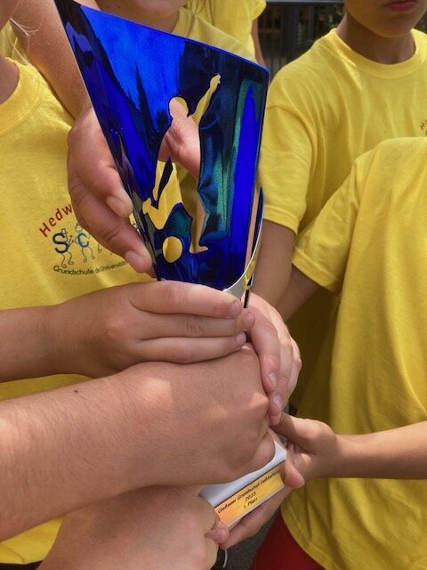 Zehn Mädchen und Jungen aus den Klassen 3 und 4 der Hedwig-Burgheim-Schule haben am Fußballturnier der Gießener Grundschulen auf dem Sportplatz der Sandfeldschule teilgenommen. Aufgeregt fuhren sie morgens mit den Betreuerinnen Frau Müller und Frau Lenz los. Verpflegt wurden sie zwischen den Spielen mit Pizza und Wasser und zum Austoben gab es eine Hüpfburg. Nach mehreren Spielen (insgesamt nahmen elf Mannschaften teil) stand fest: die Mannschaft der HBS bekommt den Pokal! Stolz präsentierten ihn die Spielerinnen und Spieler in der Schule.