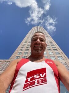 Hier stehe ich nun. Unten am Messeturm. Sonntagmorgen. Kurz nach 9 Uhr. Ich blicke nach oben. Was bin ich bloß für ein kleiner Wicht – neben diesem Bauwerk! 213 Höhenmeter geht’s da gleich hinauf oder 61 Stockwerke, zu bewältigen Mithilfe von genau 1.200 Stufen. Wer von den 238 gemeldeten Starts ist am schnellsten oben?