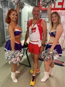Nach der interessanten Unterhaltung lässt mich mein Gesprächspartner noch nicht gehen, er besteht darauf, ein Foto im Zielbereich von mir zu schießen, auf dem ich von den beiden Cheerleaderinnen eingerahmt werde. Die beiden begrüßen mit fetziger Musik und ihren bunten Pompons alle, die es bis hier oben schaffen. Hatte ich nach meinen knapp 15 Minuten gar nicht wahrgenommen. Ich fühle mich geehrt, da nicht jeder ein solches Andenken mit nach Hause nehmen kann…