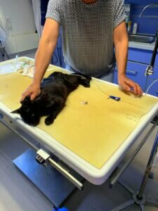 Als er sich mit letzter Kraft zu der Katzenfreundin schleppte, ging diese sofort zur ansässigen Tierärztin. Hier wird er täglich intensiv gehandelt.