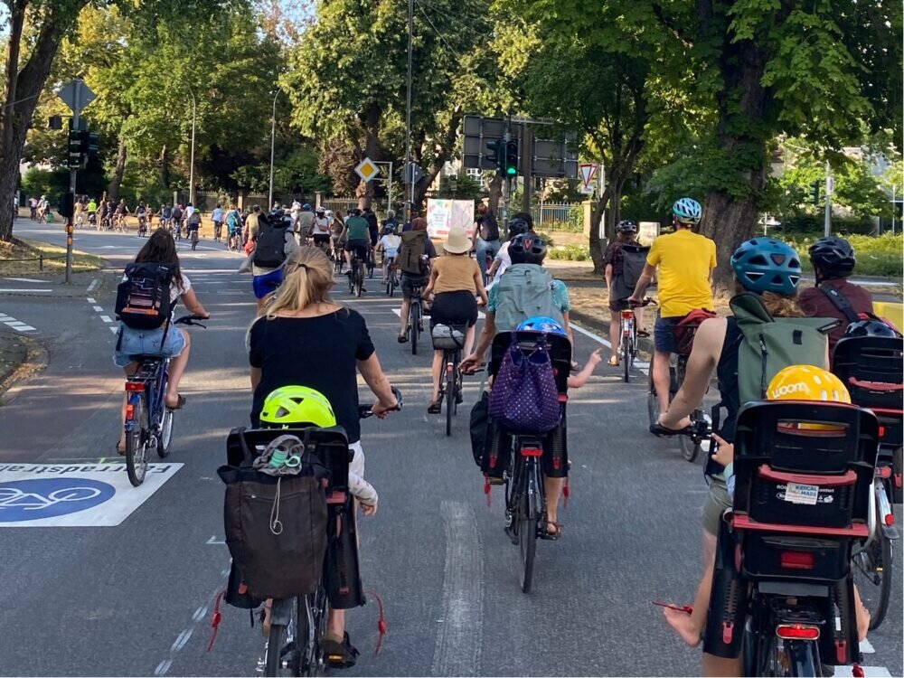 Radfahrende demonstrieren auf der Fahrradstraße der Südanlage für die Fortführung des Verkehrsversuchs auf dem Anlagenring und mehr Fahrradstraßen in Gießen.