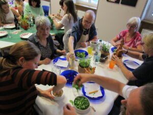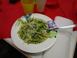 Basilikumpflanzen standen schon auf den Tischen. Sie dienten nicht nur als Dekoration zum Thema, sondern mussten sie von den Teilnehmenden zuerst gezupft werden, um die Hauptzutat des Pestos zu bekommen. In geselliger Atmosphäre machten sie sich mit Begeisterung an die Arbeit. Viel Spaß machte auch das Mörsern der Zutaten. Zur Verfügung standen einige Mörser, um authentisch zu arbeiten. Abwechselnd konnten alle Anwesenden die Basilikumblätter mit Salzkörnern, Knoblauch, Pinienkernen, Olivenöl, Pecorino und Parmesan mörsern. Und das Pesto, (fast) wie das Originale aus Genua, war fertig. In der Küche wurden Trofie, die typischen Nudeln aus Genua, die mit dem Pesto gegessen