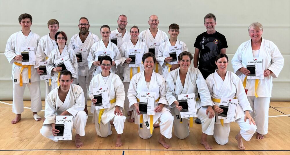 Ebenso wichtig wie das Training war bei der Sommerschule die Zeit zum Netzwerken und reden unter Gleichgesinnten, zum Beispiel bei der Lehrgangsfete mit Grillen am Samstagabend. Aber auch Prüfungen kamen nicht zu kurz. 12 Schwarzgurte waren schon am Freitag vor der Sommerschule zur Prüfung erschienen. 10 von ihnen – davon 5 aus Lich – bestanden die Prüfung und erlangten damit den nächsten Dan-Grad. Für 30 weitere Prüflinge standen Sonntagnachmittag Prüfungen an. Sie erlangten erfolgreich einen der Gürtel von gelb (8. Kyu) bis braun (1. Kyu). Wer den 1. Kyu erreicht hat, darf als nächstes die Prüfung zum Schwarzgurt ablegen, muss dafür aber wieder erst ein umfangreiches Programm an Karate-Techniken üben. Und genau dabei helfen Wochenendlehrgänge wie die Sommerschule in Lich. Die Teilnehmenden waren sich einig: Die Veranstaltung war rundum gelungen.
