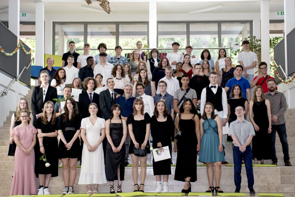 Die Klassenteams der Jahrgänge verabschiedeten ihre Abgänger*innen liebevoll mit persönlichen Reimen. Traditionell mussten die Schüler*innen erraten, welcher Spruch auf sie selbst zutrifft und dann zur Übergabe ihres Abschluss-Zeugnisses nach vorne kommen. Alle Abgänger*innen erhielten eine weiße Rose, das Symbol von Sophie Scholl, und ein Abschiedsgeschenk.