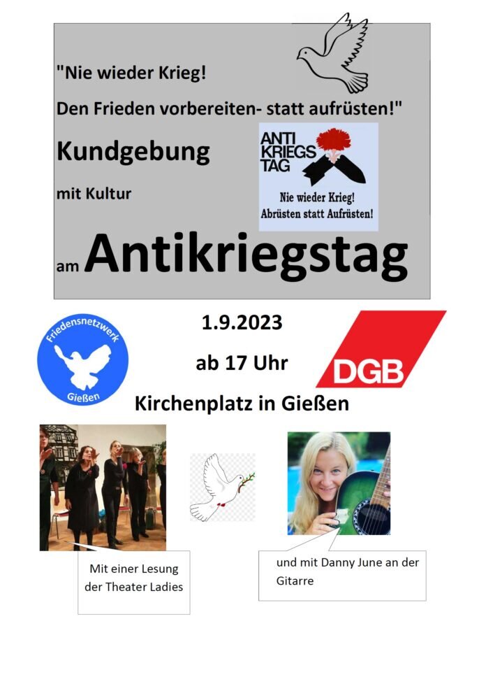 Am 01. September ist der Antikriegstag und aus diesem Anlass findet am Freitag, den 01.09.2023 ab 17.00 Uhr auf dem Kirchenplatz in Gießen eine Kundgebung mit Kultur statt. Diese steht unter dem Motto “Nie wieder Krieg! Den Frieden vorbereiten – statt aufrüsten!”. Zu den Aktion rufen das Friedensnetzwerk Gießen und der DGB Kreisverband Gießen alle Bürgerinnen und Bürger zur Teilnahme auf. Das Kulturprogramm gestalten die Theater Ladies mit einer Lesung mit Texten zu Krieg und Frieden sowie Danny June Smith an der Gitarre, die alte und neue Friedenslieder vorträgt.