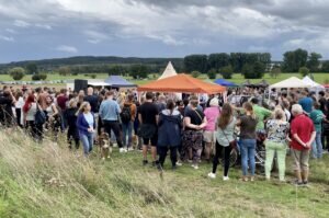 Trotz dicker Wolken und drohendem Unwetter ließen sich die unzähligen Besucher*innen nicht abhalten, an dem Fest teilzunehmen. Die Wolken hielten sich im wahrsten Sinn des Wortes im Hintergrund und so konnten alle das Fest trockenen Fußes genießen. Die vielen Zelte hätten hier im Notfall jedoch Schutz geboten.