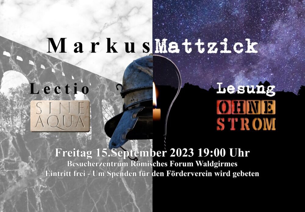 Vom Besucherzentrum aus hat man einen Blick auf die rekonstruierten Grundrisse des Römischen Forum und auf den Hügel, um den sich Umbach ausbreitet. In der Lesung „Sine Aqua (Ohne Wasser), Ohne Strom“ schlägt der in Waldgirmes aufgewachsene Schriftsteller Brücken zwischen der Infrastruktur des Römischen Reiches und der von heute.