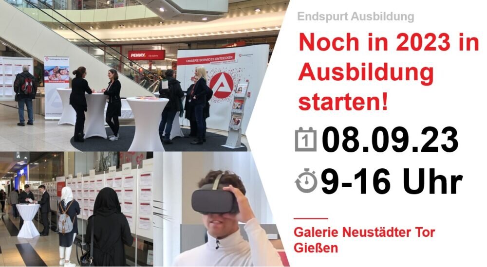 Manch ein Jugendlicher hat die Suche nach einem passenden Ausbildungsplatz für dieses Jahr bereits aufgegeben. „Aber noch ist es nicht zu spät“, betont Daniela Hach, Teamleiterin der Arbeitsagentur Gießen. „Nicht wenige Arbeitgeber sind noch auf der Suche nach einem Azubi. Diese offenen Stellen können bei „Endspurt Ausbildung“ eingesehen und zum Bewerben gleich mitgenommen werden.“ Zudem sei die Berufsberatung vor Ort. So können offene Fragen oder auch eine Neuausrichtung besprochen werden. Die Veranstaltung wird am 8. September von 9-16 Uhr in der Galerie Neustädter Tor angeboten. Angesprochen sind Ausbildungsplatzsuchende, die in diesem oder auch nächsten Jahr eine Ausbildung beginnen möchten sowie entsprechende Eltern. Auch sonstige Interessierte sind eingeladen, den Stand im Erdgeschoss des Neustädters zu besuchen. Eine Anmeldung ist nicht erforderlich.