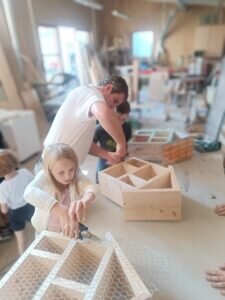 „Schlüsselfertige Übergabe“ der Häuschen hieß es für Leefke, Phillip, Linus und Elias am vergangenen Samstag in der Tischlerei von Björn Platt. Zusammen mit unseren Kids baute er bereits im Juli die kreativen Einzelbauten zusammen.