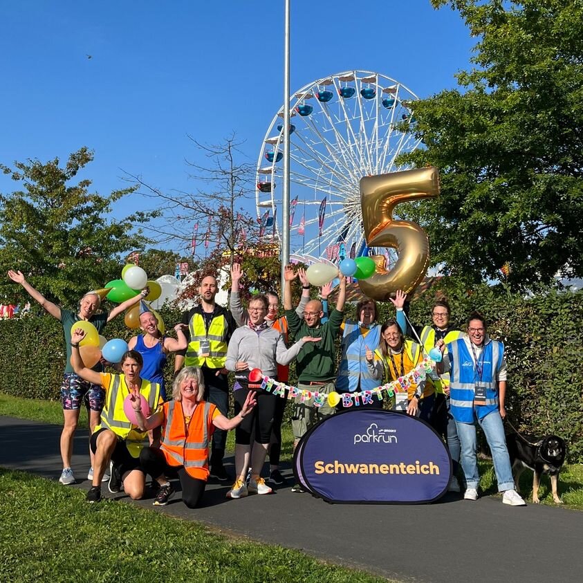Und das wurde (unter anderem) alles gefeiert: der Schwanenteich parkrun für seinen fünften Geburtstag, Ziggi für die musikalische Einstimmung mit Gesang und Gitarre, Annabell für zehn Teilnahmen als Jugendliche, Lisa als Geburtstagskind, Marina für ihre legendären Moderationen als Laufleiterin, die Gäste aus England mit über 250 und 500 parkrun-Teilnahmen und im Ziel dann u.a. Matthias für eine weitere persönliche Bestzeit, und natürlich alle, die in den letzten fünf Jahren dafür gesorgt haben, dass der Schwanenteich parkrun jeden Samstag stattfinden kann – insgesamt schon über 350 unterschiedliche Helfer*innen, und damit der zweithöchste Wert aller parkruns in Deutschland!
