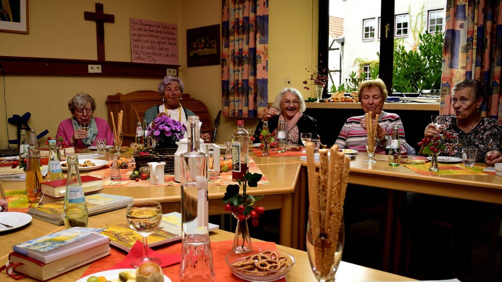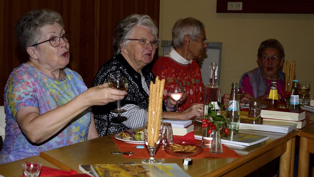 Der Evangelische Seniorenkreis feierte in der Stadtkirche sein Weinfest. Wöchentlich, Donnerstags, treffen sich 17 Seniorinnen – darunter 2 Senioren – in einem der Gemeindesäle zum gemütlichen Beisammensein. Die Runde wird mit geistlichem Wort von Pfr. Eberhard Hampel bzw. Pfr`in Isabelle Röhr eröffnet. Im Anschluss daran wird bei meist selbst gebackenem Kuchen Kaffe getrunken.