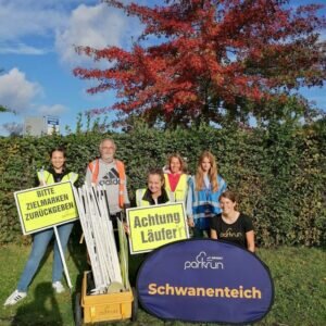 Immer wieder wurde verdeutlicht, dass es wichtig ist, im Notfall statt nichts etwas zu tun – im besten Fall den Dreiklang durchzuführen, aber auch z.B. umstehende Personen zur Mithilfe aufzufordern. Und wie ist das bei Notfällen beim Schwanenteich parkrun? Es gibt immer einen Defibrillator im Ziel und das DRK am Ende der Eichgärtenallee. Wenn es Teilnehmenden (oder Helfenden) nicht gut geht, sind diese dazu aufgefordert, jemanden nach Unterstützung zu fragen und im Zweifel den eigenen Lauf oder Spaziergang zu stoppen. Zudem sollten alle, wenn sie das Gefühl haben, es geht jemand anderem nicht gut, diese Person einfach ansprechen.