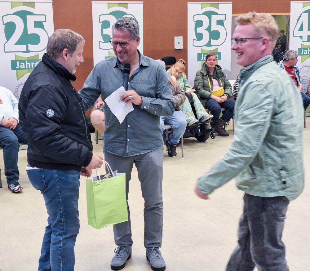 Zu der Feiergesellschaft gesellten sich auch die Gratulanten Maren Müller-Erichsen (Aufsichtsratsvorsitzende Lebenshilfe Gießen) sowie Dirk Oßwald (Vorstand Lebenshilfe Gießen). Oßwald berichtete den geehrten Mitarbeiter*innen: „Wenn ich außerhalb der Werkstatt mit unseren Kunden spreche, höre ich immer wieder großes Lob. Unsere Kunden sind zufrieden, weil die Qualität Ihrer Arbeit so hoch ist.“