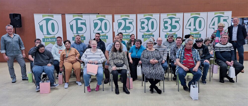 Für die Mitarbeiter*innen mit und ohne Behinderung war es die erste große Ehrungsfeier – gespickt mit Musik, Tanz, Polonaise und leckerem Essen – seit Beginn der Corona-Pandemie. 2022 wurden die Jubilare noch in kleineren Gruppen geehrt, diesmal kamen alle Beschäftigten im Speisesaal der Limeswerkstatt zusammen. Jörg Stommel würdigte jeden Mitarbeiter einzeln und skizzierte in kurzen Worten die jeweilige Arbeitsbiografie. Geschenke gab es natürlich ebenfalls.