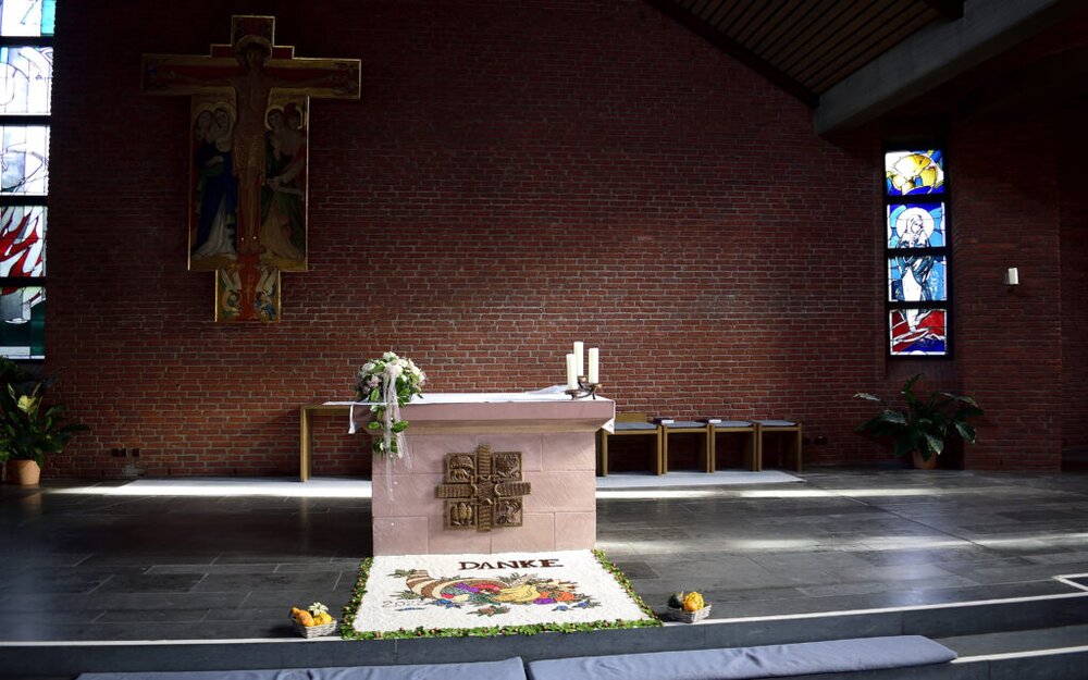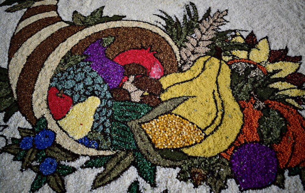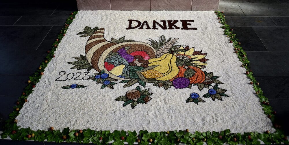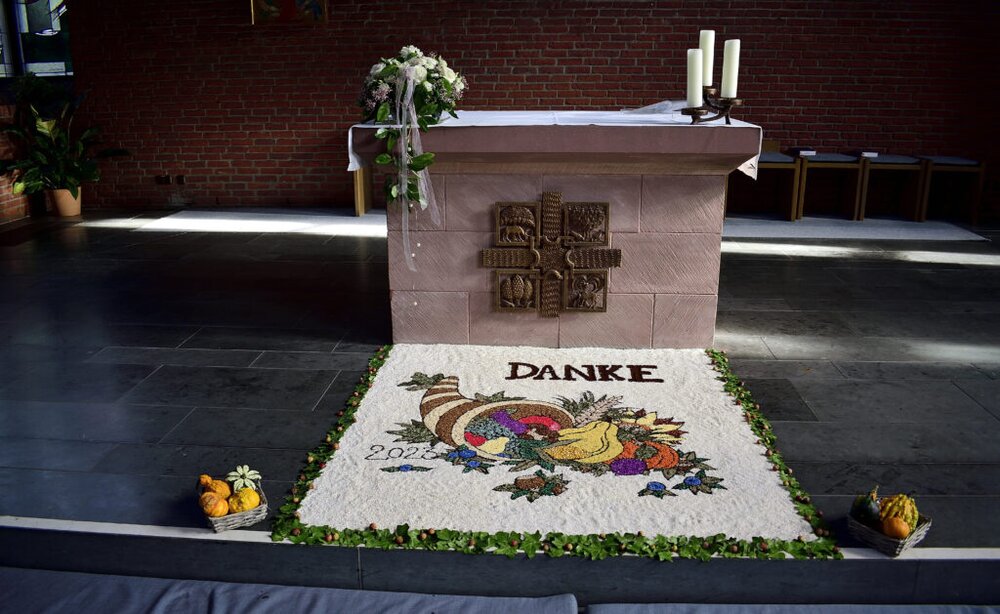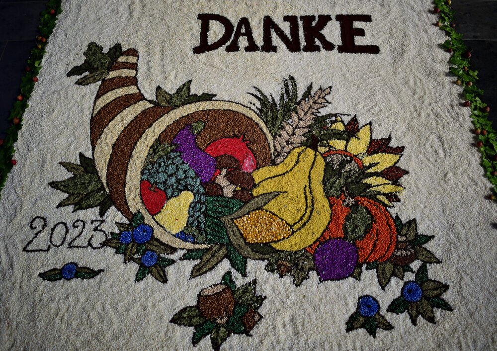 Seit 18 Jahren ist es in der katholischen Kirchengemeinde Grünberg Tradition, dass zu Erntedankfest ein Körnerteppich vor dem Altar gestaltet wird. Dieses Jahr zeigte er sich zum ersten Mal mit 3-D-Effekten. Annalena Vogler lieferte mit ihrer Zeichnung bereits zum zehnten Mal die Vorlage.
