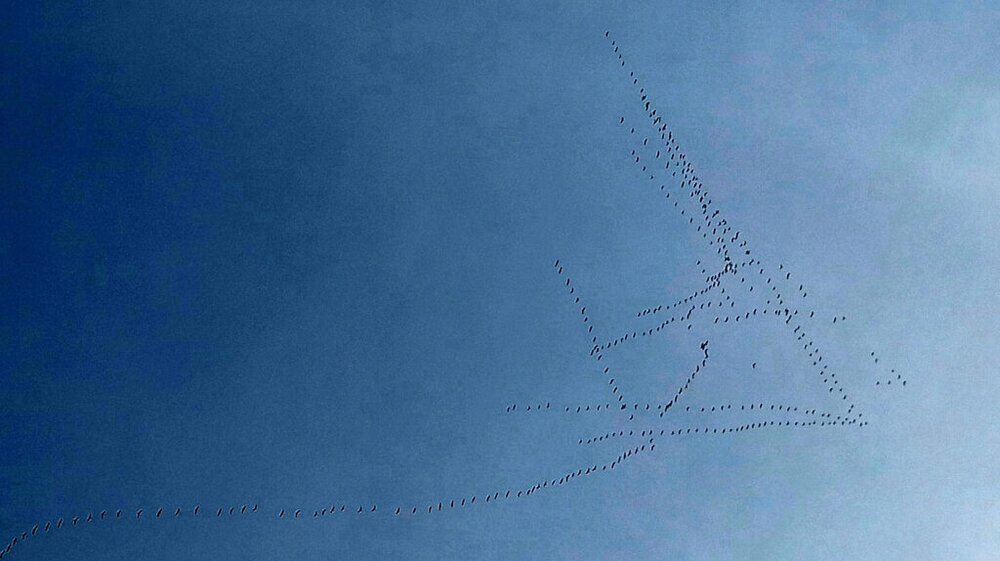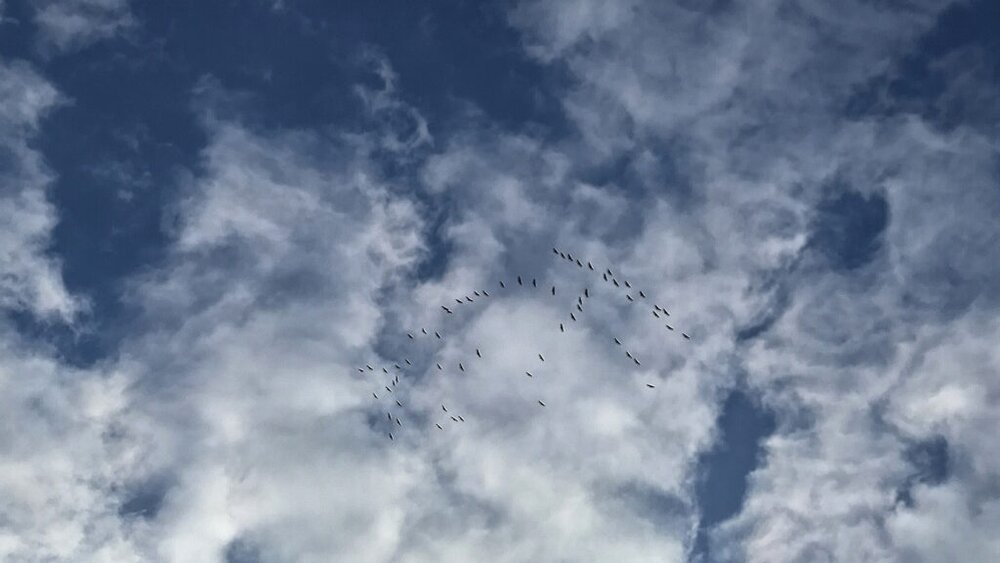 Recht spät ziehen die Kraniche nun in Massen Richtung Winterquartiere. Der Zeitpunkt des Kranichzuges ist stark vom Wetter abhängig, denn die Vögel ziehen bei schwachem oder idealerweise bei Rückenwind – also wenn er aus nordöstlichen Richtungen weht. Das Wetter heute war natürlich passend für die majestätischen Zugvögel.