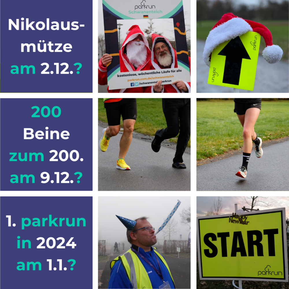 Am 9.12. feiern wir dann unseren 200. Schwanenteich parkrun – ein (inoffizieller) Meilenstein, an dem wir die Magnum-Flasche-Sekt (noch verschlossen von unserem 5. Geburtstag) öffnen werden und es bestimmt auch Kuchen geben wird! Schaffen wir es an diesem Tag, 200 Beine zusammen zu bekommen – ob laufend, walkend, gehend oder helfend? Bringt gerne jemanden zu unserem Jubiläum mit, denn Ihr wisst ja: Gemeinsam ist parkrun am schönsten!