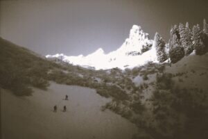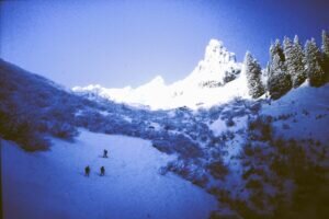 Und schließlich sind wir ganz im Süden, im hintersten Zipfel des Kleinwalsertals, in der Nähe des Widdersteins, bei einer Skitour mit Steigfellen etc. an einem bitterkalten Silvestertag 1984. Der exquisite Skiberg ist die Höfenspitze oder auch Höferspitze genannt. Dies ist jedoch nicht der hier aufragende Felszacken, sondern ein weiter hinten liegender sanfter Grasbuckel. Bei der Abfahrt bekamen zwei von uns vieren weiße Nasenspitzen – die ersten Erfrierungszeichen: