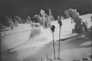 Und nunmehr geht’s auf den Gipfel des Brocken, nicht nachts, wie man denken könnte, sondern kurz nach einem Schneesturm. Ich war seinerzeit mit Langlaufskiern hochgewandert und mühsam abgefahren: