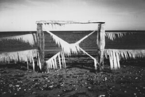 Es folgt ein vereister Schafzaun am Strand der Insel Fehmarn: