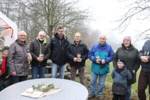 Mit einer von Thorsten Herdejost geführten kurzen Gemarkungswanderung mit 32 Teilnehmern startete in Lardenbach die Feier zum 50-jährigen Bestehen der örtlichen Grillhütte. Für deren Durchführung hatte die Vereinsgemeinschaft mit der Freiwilligen Feuerwehr, dem Spiel- und Sportverein, dem Männergesangverein, dem Obstbau- und Kelterverein und der Jagdgenossenschaft gesorgt. So gab es für die Wanderer und die weiteren zahlreichen Gäste in und auf dem Gelände der Grillhütte einen unterhaltsamen Nachmittag mit reichhaltigem Angebot an Speisen und Getränken. Zur Stärkung standen Grillwürstchen und Kuchen bereit. An der Feuerstelle in der Hütte konnte man sich auch sein eigenes Stockbrot backen. Zum Durstlöschen mit der gleichzeitigen Möglichkeit zum Aufwärmen nutzten viele den angebotenen Glühwein, den Kinderpunsch und den Kaffee. Angeboten wurden zudem verschiedene Kaltgetränke. Ortsvorsteher Christian Ruppel ging in seiner Rede auf die von den 26 ehrenamtlichen Helfern unter nicht so einfachen Umständen entstandene Grillhütte ein. Der Sinn der unter der Federführung des langjährigen Lardenbacher Bürgermeisters Reinhard Mölcher sen. und des zuständigen Oberförsters Karlheinz Keitzer vorgenommenen Errichtung der Hütte diente in erster Linie eher dem Gemeinwohl, dem Gemeinschaftssinn und dem Bestreben etwas Gutes für das Dorf zu schaffen. Ruppel appellierte daher, dass auch zukünftig die Dorfbewohner aktiv anpacken und für eine gute wie einst in den siebziger Jahren selbstverständliche Dorfgemeinschaft einzutreten. Hierbei sollten neben den Jugendlichen auch Nachbarn und die neu Hinzugezogenen aus dem Neubaugebiet zum Besuch von Veranstaltungen und zum im Ort animiert werden. Als eine der ersten Grillhütten der Region war diese eher im rustikalen Stil ohne Strom und Wasserversorgung erstellt worden. Durch ihre idyllische Lage am Steinbruch Hilgesberg konnten neben Privatfeiern dort auch zahlreiche größere Veranstaltungen wie Gottesdienste, Motorradtreffen, Konzerte, Wandertage und Sommerfeste durchgeführt werden. Der Ortsvorsteher dankte abschließend den damaligen Erbauern und den seitherigen Hüttenwarten für die geleistete Arbeit. Mit einem Präsent bedachte Ruppel die vier anwesenden der noch fünf lebenden ehrenamtlichen Helfer Jürgen Maus, Dieter Kraft, Manfred Reining sen. und Reiner Roth. Krankheitsbedingt konnte Helmut Volp nicht an der Veranstaltung teilnehmen.