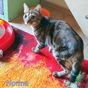 Norma, geboren ca. Juli 2023, ist ein sehr süßes Kätzchen. Sie wurde mit vier Wochen alleine auf der Strasse entdeckt. In einer Familie mit Hunden wurde sie aufgezogen. Fast könnte man vermuten, sie hält sich auch für einen Hund!
