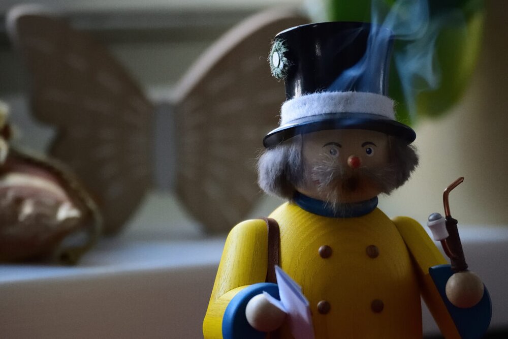 Unser Räuchermännchen hat `seine Arbeit´ bald wieder verrichtet. Zur Advents- und Weihnachtszeit schmückt der >Erzgebirgische Postbote< mit Zylinder, Pfeife und Brief – unser Wohnzimmer.