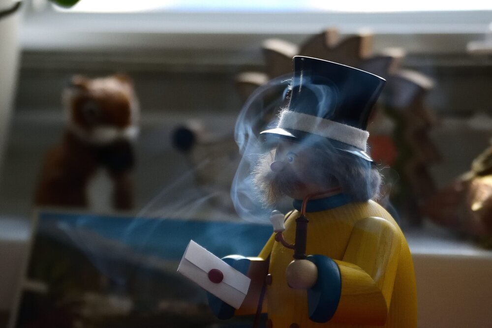 Unser Räuchermännchen hat `seine Arbeit´ bald wieder verrichtet. Zur Advents- und Weihnachtszeit schmückt der >Erzgebirgische Postbote< mit Zylinder, Pfeife und Brief – unser Wohnzimmer.