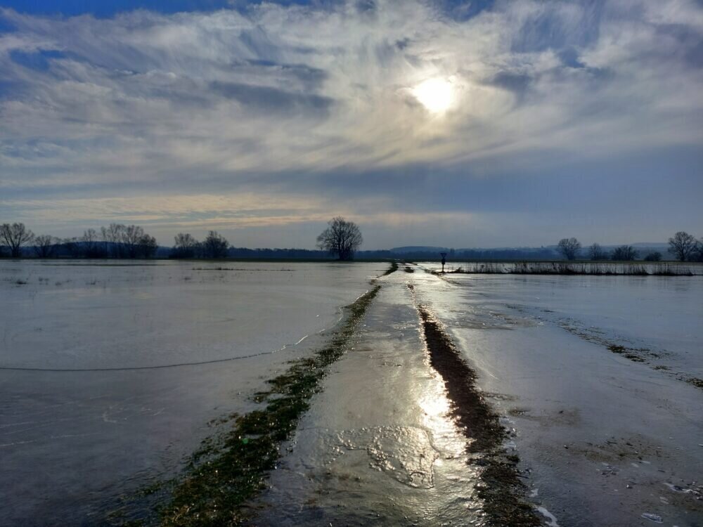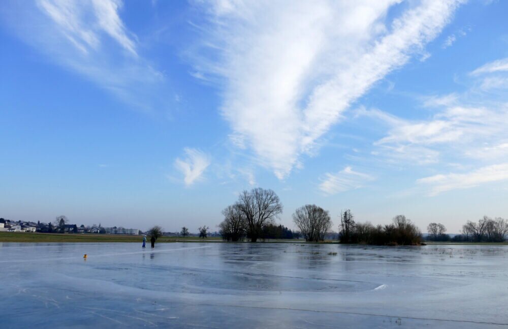 Vereiste Lahnaue bei Heuchelheim Von Irmtraut Gottschald - 11. Januar 2024 265 Aus Wasser wurde Eis. Die überschwemmde Lahnaue ist nun eine riesige Eisfläche geworden. Solange es Nachts weiterhin so kalt ist können die Menschen dort viel Spaß haben mit ihren Unternehmungen auf der riesengroßen Eisfläche. Das Eis trägt Hier kann man große Kreise ziehen