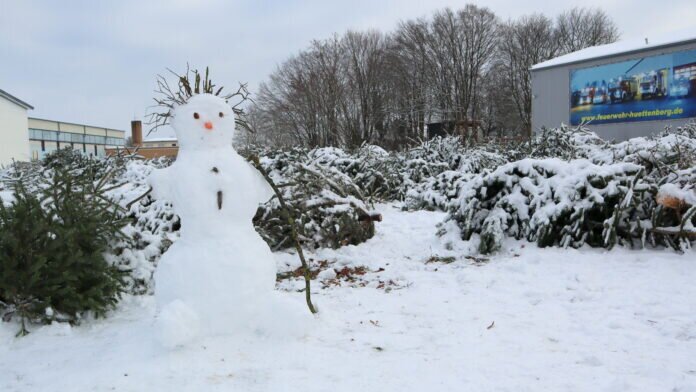 Die ausgedienten Weihnachtsbäume wurden kürzlich von der Jugendfeuerwehr Hüttenberg eingesammelt und auf dem Festplatz neben dem Feuerwehrhaus zwischengelagert. Hier warten sie auf die Mitarbeiter des Bauhofs die sie dem Häcksler umweltgerecht zerkleinern. Dies verzögerte sich aber nach dem Wintereinbruch, nichts ist mehr übrig vom Glanz und Glitzer, den sie noch an Weihnachten hatten. Damit den einst stolzen Bäumen bis zu ihrer Verwertung nichts passiert, haben sie einen Aufpasser bekommen. Unbekannte, vermutlich kleinere Künstler, haben den Weihnachtsbäumen einen Schneemann mit wilder Frisur zur Seite gestellt. Mit dem Stock passt er auf, dass den Bäumen nichts passiert.