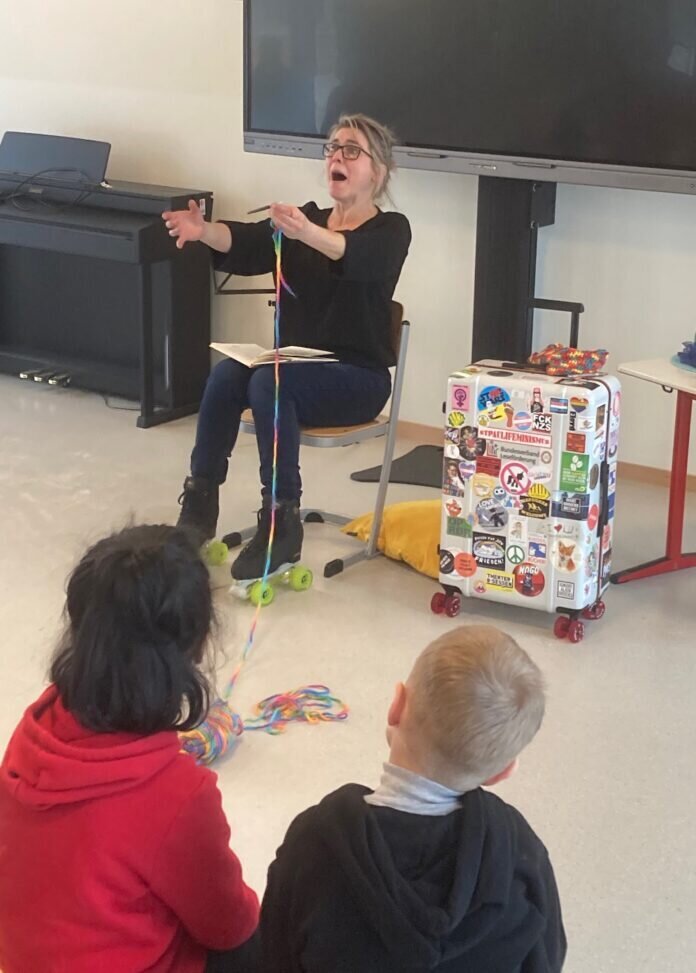 Aus dem „Tage-b-b-buch eines Überfliegers“ las die Autorin Frauke Angel in der neuen Mensa der Hedwig-Burgheim-Schule vor. Dass sie dabei auf Rollschuhen hin und her fuhr oder häkelte, machte die Lesung für die Schülerinnen und Schüler der Klassen 1 bis 4 besonders abwechslungsreich. Frauke Angel ist nicht nur Autorin, sondern auch Schauspielerin. So war diese Lesung gleichzeitig auch ein Theaterstück. Im Buch geht es um den stotternden Tomke, der gerne eine Gedankenlesemaschine erfinden würde, damit er nicht mehr so viel sprechen muss. Man erfährt viel über seine Familie, seine Schulklasse, seine Nachbarn und warum er das Rollschuhfahren lernt. Nach der Lesung versprach Frauke Angel: „Ihr könnt mich alles fragen!“ Also wurde es eine interessante Frage-Antwort-Runde, in der sehr persönliche Fragen gestellt wurden und die Kinder auch etwas darüber erfuhren, wer alles an einem Buch verdient.