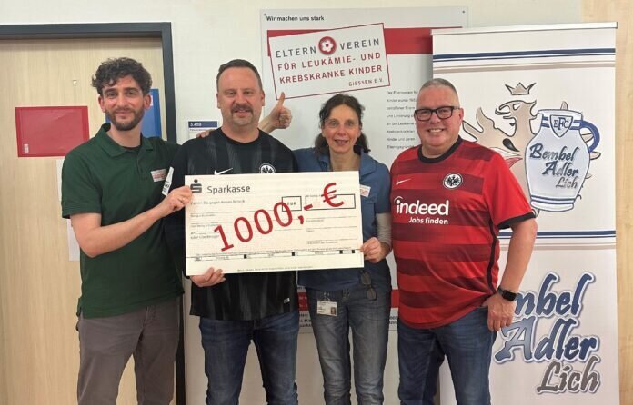 Die Mitglieder des Eintracht Frankfurt Fanclubs BembelAdler Lich e.V. waren Ende letzten Jahres sehr aktiv: So engagierte man sich im November bei der Auswärtsfahrt zum Bundesligaspiel bei Werder Bremen und übernahm das Catering im Fanbus. Außerdem schenkte der Verein kurz vor Weihnachten im Rahmen des Ober-Bessinger Krippenweges heißen Apfelwein aus und verpflegte die Besucher mit Würstchen, Brezeln und weiteren Leckereien. Die Erlöse aus diesen beiden Aktionen wurden deutlich aufgestockt und nun als Spende in Höhe von 1.000 Euro dem Elternverein für leukämie- und krebskranke Kinder, Gießen e. V. übergeben.