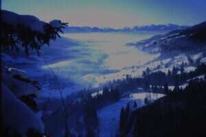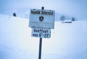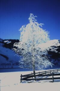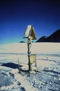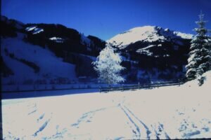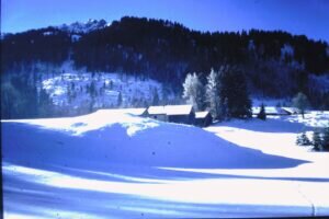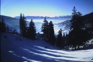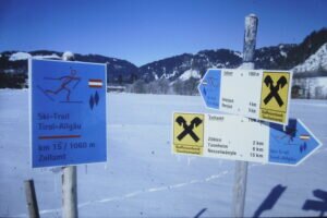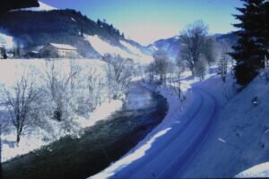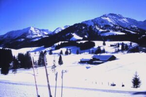 Meine Route vor etlichen Jahren (wieder einmal gescannte alte Dias) verlief von Unterjoch über Schattwald und Zöblen nach Tannheim und auf demselben Weg wieder zurück. Von Unterjoch geht es gleich die größte Steigung auf den etwa 275 m höher gelegenen höchsten Punkt der Tour.