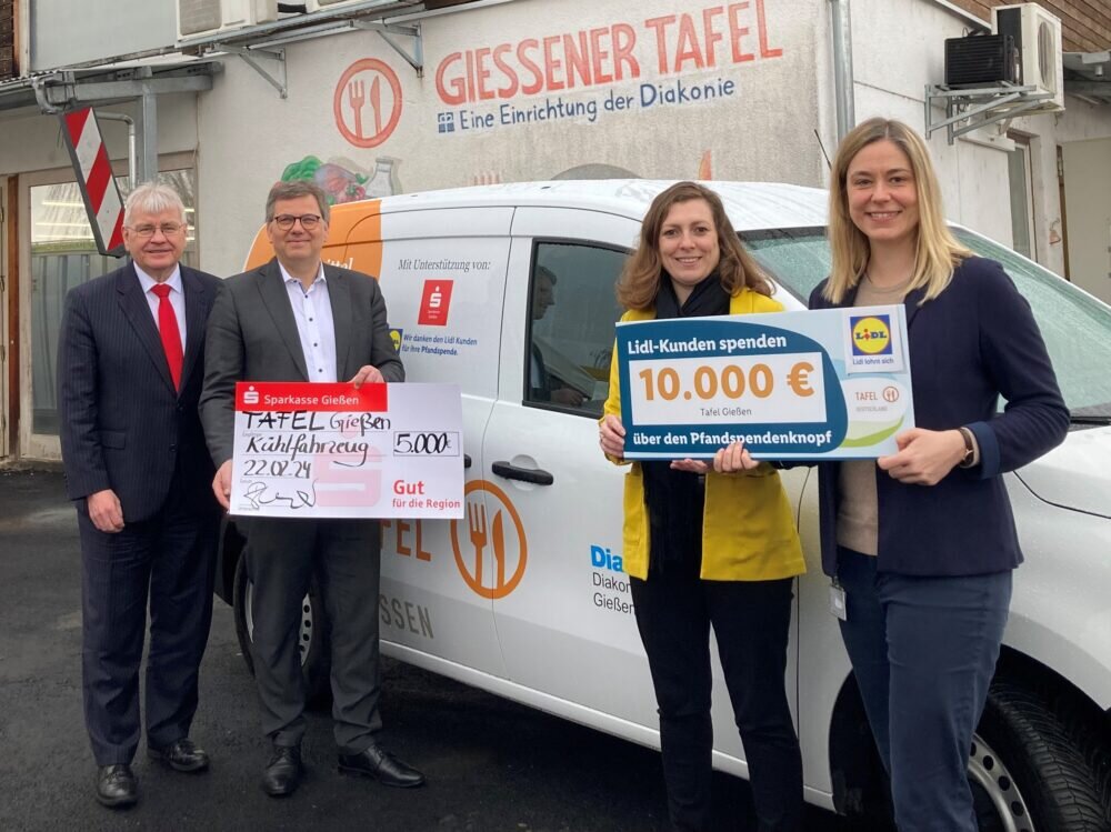 Die Tafel Gießen hat ein neues Kühlfahrzeug für ihren Bringdienst erhalten. Damit wird aktuell 65 körper- und gehbehinderten Menschen in 54 Haushalten, die ihre Lebensmittel nicht selbst abholen können, die Ware ins Haus gebracht. Möglich machte diese wichtige Anschaffung eine Vielzahl von kleinen und großen Spenden. 10.000 Euro kamen allein aus der LIDL Pfandspende und 5.000 Euro von der Gemeinnützigen Stiftung der Sparkasse Gießen.