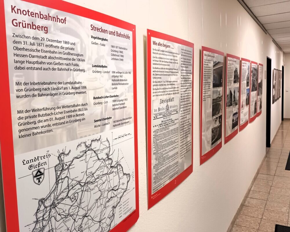Mit großformatigen Ausstellungstafel wird mit zahlreichen historischen Fotografien, Plänen und Informationen einen Blick auf die über 150-jährige Historie der Eisenbahnen und Bahnhöfe in der Großgemeinde Grünberg geworfen. Bahnhistorische Exponate ergänzen die Ausstellung.