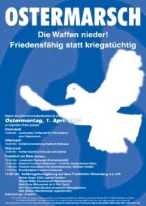 Am Ostermontag, den 01.04.2024, finden die hessischen Ostermärsche traditionell mit der zentralen Veranstaltung in Frankfurt ihren Abschluss. In mehreren Sternmärschen laufen die “Ostermarschierer” zum Frankfurter Römer, wo um 13.00 Uhr die Abschlusskundgebung stattfindet. Alle Interessierten aus Gießen, die mit nach Frankfurt kommen möchten, treffen sich um 09.00 Uhr am Gießener Bahnhof. Gemeinsam geht es mit dem Zug nach FFM, wo um 11.00 Uhr vor dem US-Generalkonsulat (Gießener Straße/ Ecke Marbachweg) der Demozug zum Römer startet.