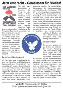 Kontakt zum Gießener Friedensnetzwerk gibt es auch per Mail an Giessener-Friedensnetzwerk@web.de.