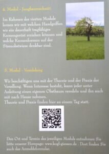 Helga Zerb wies darauf hin, dass der Kreisverband eine Broschüre zum Thema „Streuobstwiesenpfleger“ veröffentlicht hat. Fünf verschiedene Ausbildungsmodule werden darin beschrieben, die zeitlich unabhängig voneinander belegt werden können. Nach einem oder zwei Jahren, je nachdem wie der einzelne Teilnehmer die Module absolviert hat, wird der Teilnehmer als „Streuobstwiesenpfleger“ mit einer Urkunde zertifiziert.