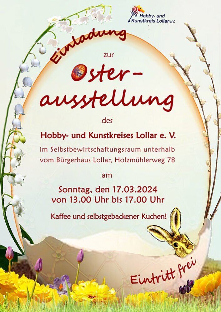 Die diesjährige Osterausstellung findet am Sonntag, den 17.03.2024 von 13.00 Uhr bis 17.00 Uhr im Selbstbewirtschaftungsraum des Bürgerhauses Lollar statt (Hinweisschilder zum Eingang). Wie immer gibt es Kaffee und selbstgebackenen Kuchen. Wir freuen uns auf Ihren Besuch!