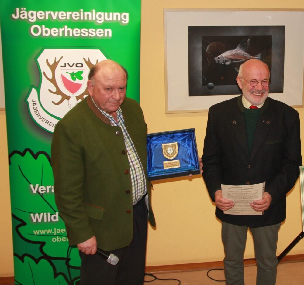 Im Rahmen der Mitgliederversammlung erhielt der Tiermediziner Dr. Michael Weiler den diesjährigen Ehrenpreis für Naturschutz der Jägervereinigung Oberhessen e.V..  Die Verleihung an den früheren Inhaber und medizinischen Leiter der Pferdeklinik Gelnhausen nahm der Vereinsvorsitzender Helmut Nickel vor. Neben der Klinikleitung war Weiler als Chairman auch in Russland für den Aufbau von ähnlichen Kliniken verantwortlich. Wie Nickel in seiner Laudatio ausführte, sammelte Dr. Weiler durch sein dortiges Wirken sowie durch den frühen Kontakt mit Wölfen und den damit verbundenen Problemen sehr viel Erfahrung. Weiteres Wissen über den Wolf habe er sich aus wissenschaftlicher Literatur von der jagdlichen Fakultät der russischen Universität Irkutsk angeeignet. Die seit dem 19. Jahrhundert bis heute dort archivierten wissenschaftlichen Werke über den Wolf hätten jedoch aktuell auf die hiesige Wolfspolitik keinen Einfluss, bzw. würden hier nicht berücksichtigt. Grundsätzlich habe Dr. Weiler keine Abneigung gegen den Wolf. Kritisch sehe er jedoch, dass historische und aktuelle wissenschaftliche Erfahrungen im Bereich Schutz und Gefährdung von Mensch und Tier sowie Maßnahmen zur Prävention und Bejagung hierzulande ignoriert werden. Aufgrund dieser Entwicklung weise der Ruheständler durch Vorträge und Interviews jenseits der urbanen rosaroten Brille mit Beweisen und Fakten auf die tatsächliche Wolfsproblematik in Deutschland hin. Nickel stellte dabei besonders den Mut heraus, da doch militante Wolfsschützer oftmals Beleidigungen und Drohungen aussprechen würden. Sein Einsatz und seine Courage für eine faktenbezogene Wolfspolitik zum Schutz von Menschen als auch zum Arten- und Tierschutz seien vorbildlich und verdienen somit den von der Jägervereinigung Oberhessen mit großer Freude verliehenen Ehrenpreis für Naturschutz.