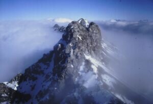 Der Nebelhorngipfel ist (in schneefreien Jahreszeiten) der Ausgangspunkt zum Hindelanger Klettersteig in Richtung Osten. Die ersten Gipfel nach einem Zwischenabstieg sind der westliche und östliche Wengenkopf, die sich hier aus den Wolken erheben: