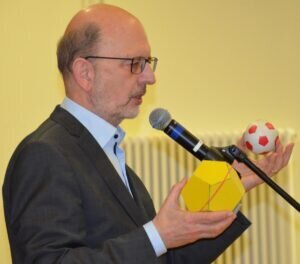 Beutelsbacher begann seinen Vortrag mit dem Zählen der sechs Blütenblätter einer Osterglocke. Nicht alle Blüten hätten sechs Blätter, es gebe auch Blüten mit nur fünf Blätter, wie die Apfelblüten. Beutelsbacher hatte eine „Papierblüte“ dabei, die sich „als regelmäßiges Ding“ aus sechs „Fünfecken“ zusammensetzte. Er legte eine gleiche zweite Papierblüte auf die erste und spannte mit einem Gummiring beide Papierblüten zusammen. Unter der Spannung des Gummirings „ploppten“ die beiden flach übereinandergelegten Papierblüten zu einem räumlichen „Superding“ mit zwölf Ecken auseinander, das einem „eckigen“ Fußball ähnelte. Zu diesem Überraschungseffekt spendierte das begeisterte Publikum viel Applaus. An einem kleinen runden Fußball zeigte Beutelsbacher die Zusammensetzung der Ballhülle eines runden Fußballes aus zwölf Fünfecken und 21 Sechsecken.