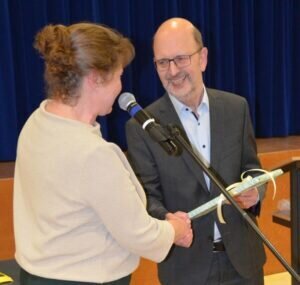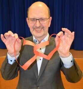 Den Höhepunkt erlebten die Gäste, als Beutelsbacher zwei weitere Papierstreifen in bestimmter Weise verdrehte und zu zusammenhängenden „Möbius Bändern“ verklebte. Vorsichtig schnitt er mit einer Schere die Bänder jeweils in der Mitte auseinander. Als er das Ergebnis dieses Experiments hochhielt, sahen die Zuschauer mit Erstaunen und anschließendem Applaus zwei ineinander verschlungene Herzen.