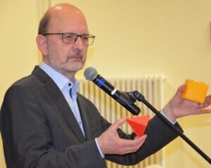Weitere Beispiele aus der Geometrie riefen Erstaunen hervor. Aus einem Würfel „zauberte“ Beutelsbacher eine Pyramide hervor und lies die Gäste die schöne „Regelmäßigkeit“ dieser Körper mit ihren Flächen, Ecken und Kanten bewundern. „Schon der griechische Philosoph Platon sah in diesen Körpern Symbole, die er mit den vier antiken Elementen Erde, Feuer, Luft und Wasser verband“ berichtete Beutelsbacher.